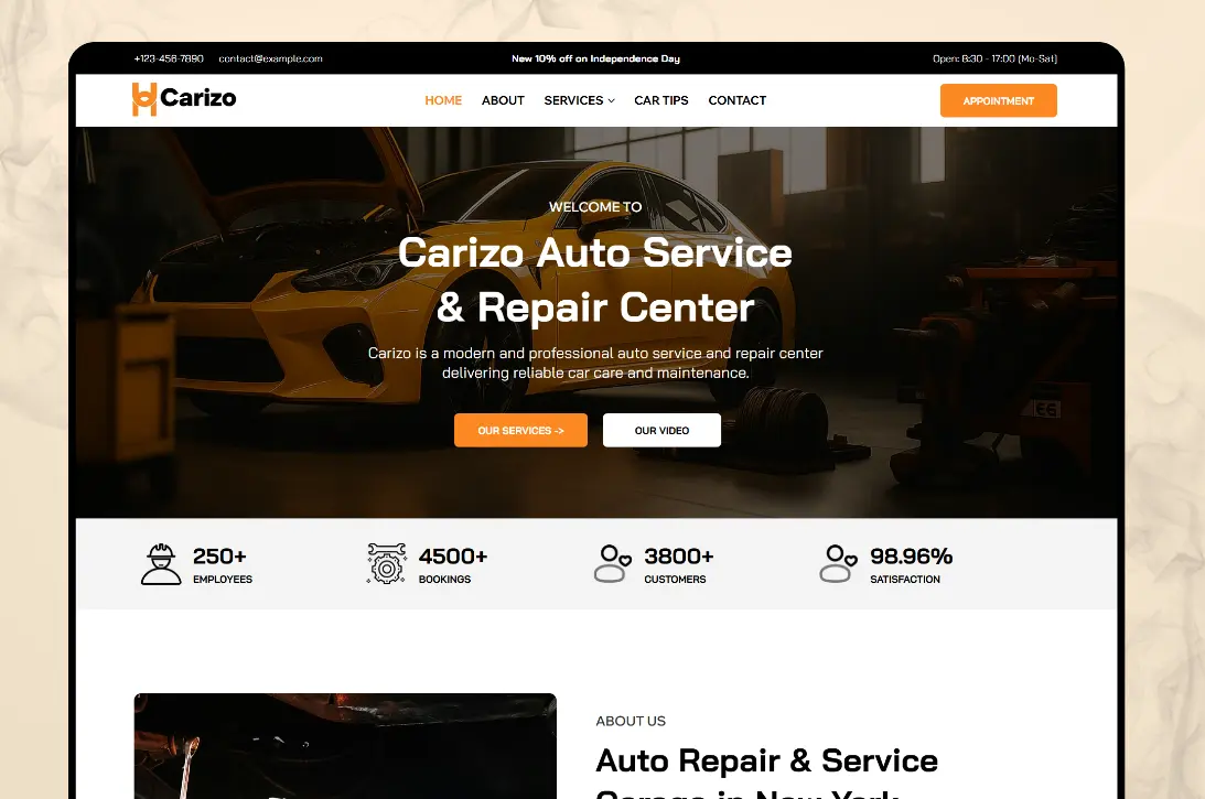 Build a powerful online presence for your auto service business with Carizo. This Wix Studio template is perfect for car repair centers, garages, and mechanics—easy to customize, mobile-friendly, and designed to convert visitors into customers.